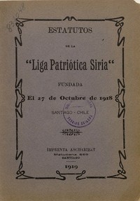 Estatutos de la "Liga Patriótica Siria" : Fundada el 27 de octubre de 1918 / Liga Patriótica Siria ( Chile). Santiago : Impr. Aschabibat, 1919. 12,12p. ; 21 cm. .