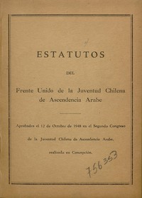 Estatutos / Frente Unido de la Juventud Chilena de Ascendencia Arabe. Santiago : [s.n., 1949] (Santiago : Imp. El Imparcial) 11 p. ; 19 cm. .