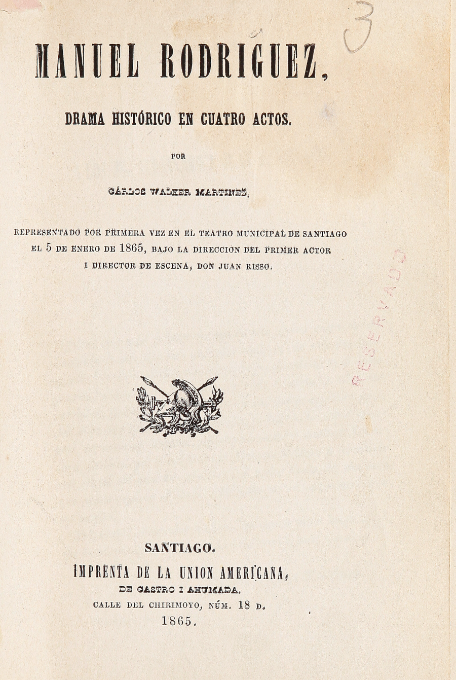 Manuel Rodríguez : drama histórico en cuatro actos por Carlos Walker Martínez representado por primera vez en el Teatro Municipal de Santiago el 5 de enero de 1865, bajo la dirección del primer actor i director de escena, don Juan Risso".