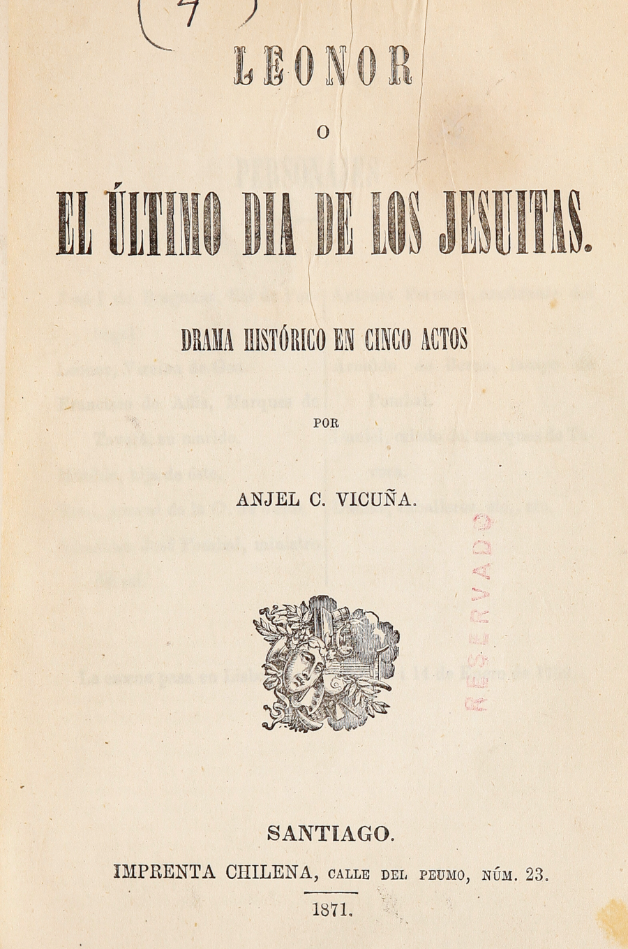 Leonor, o, El último día de los jesuítas : drama histórico en cinco actos por Anjel C. Vicuña.