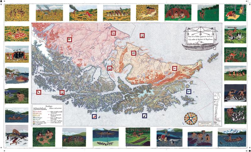 Mapa de los pueblos originarios y ruta náutica de Hernando de Magallanes [material cartográfico] ilustrado por el artista chileno Ignacio del Real.