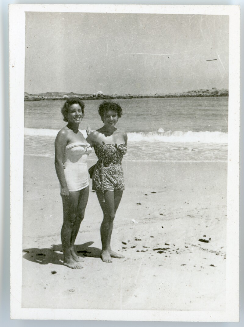 [Mujer y niña posando de pie, vestidas con traje de baño en la playa] [Fotografía].