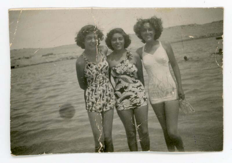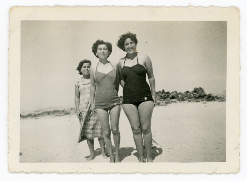 [Retrato grupal de tres mujeres en la playa] [Fotografía].