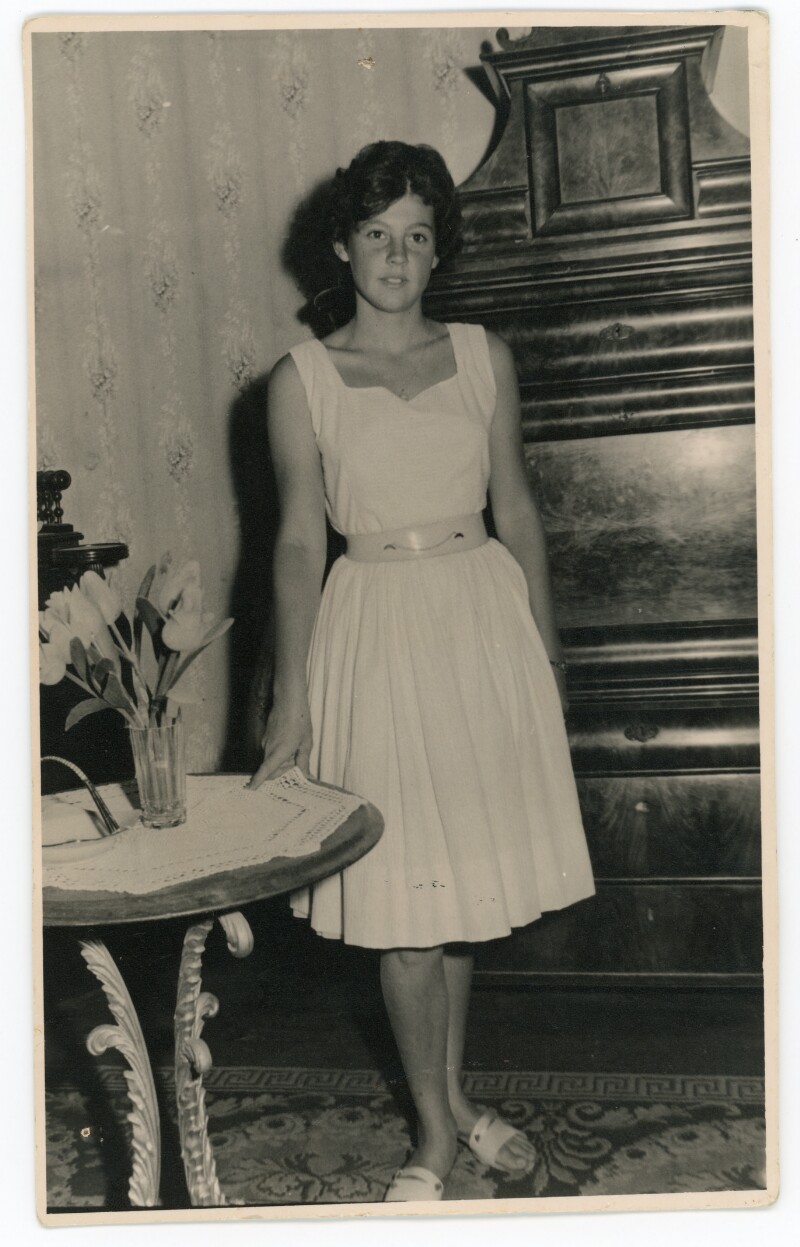 [Retrato individual de una mujer joven con vestido] [Fotografía].
