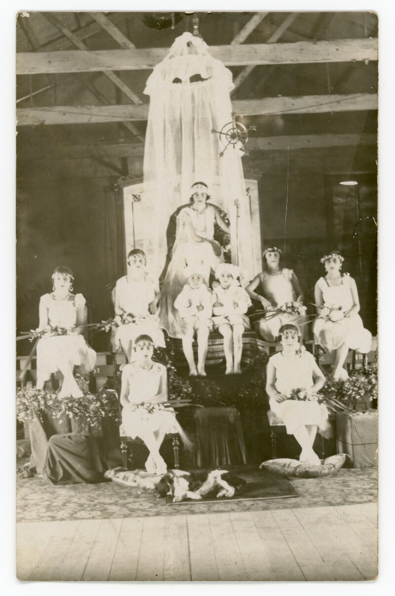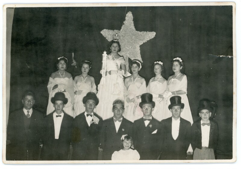 [Retrato grupal mixto de reinas y pajes de la fiesta de la primavera de Caldera] [Fotografía].