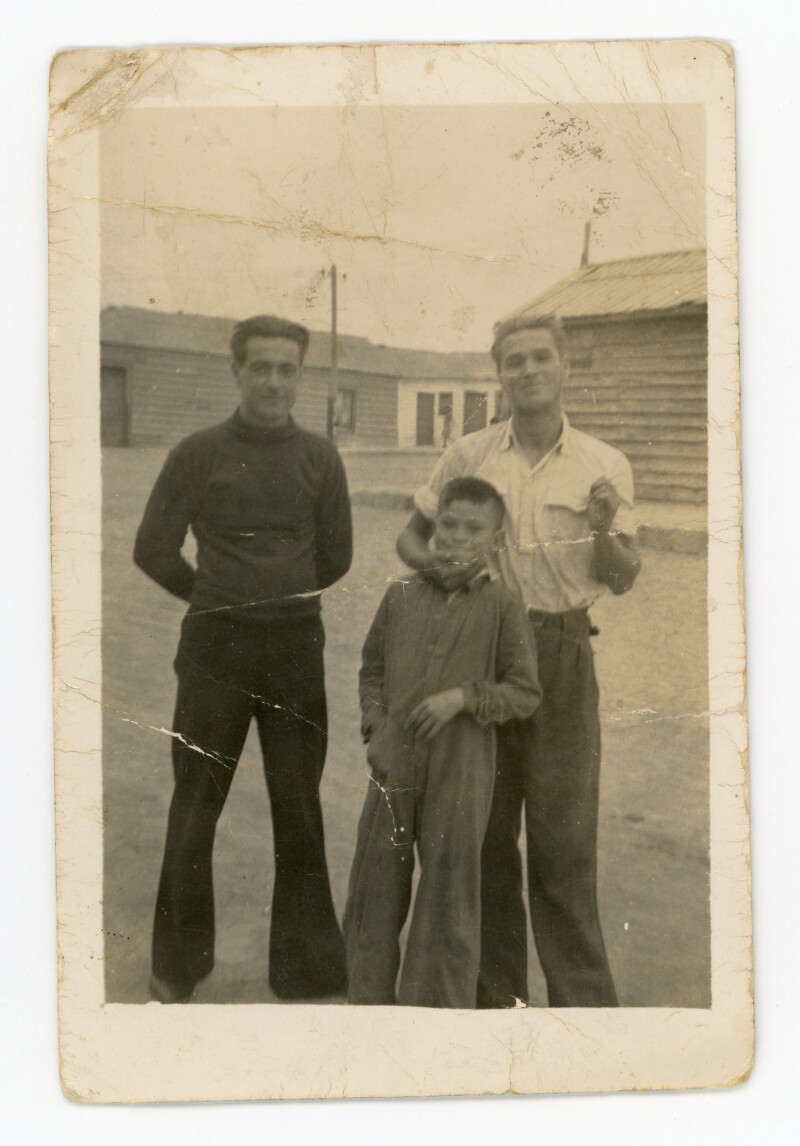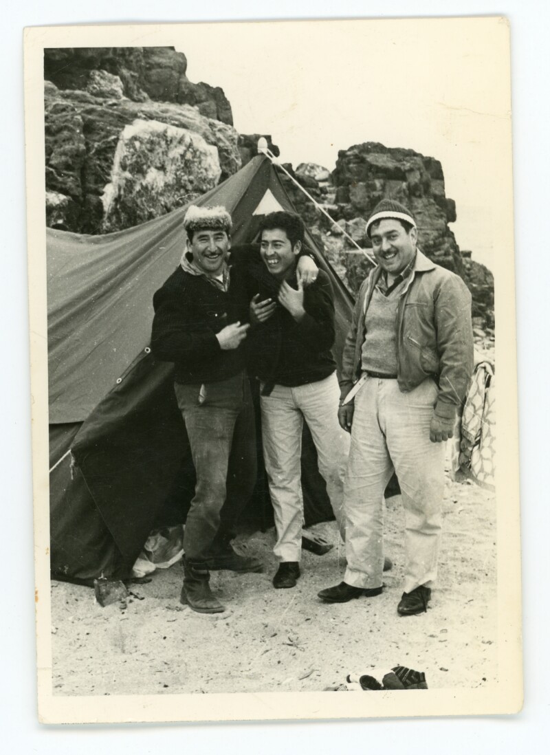[Tres hombres de pie en la costa de Caldera] [Fotografía].
