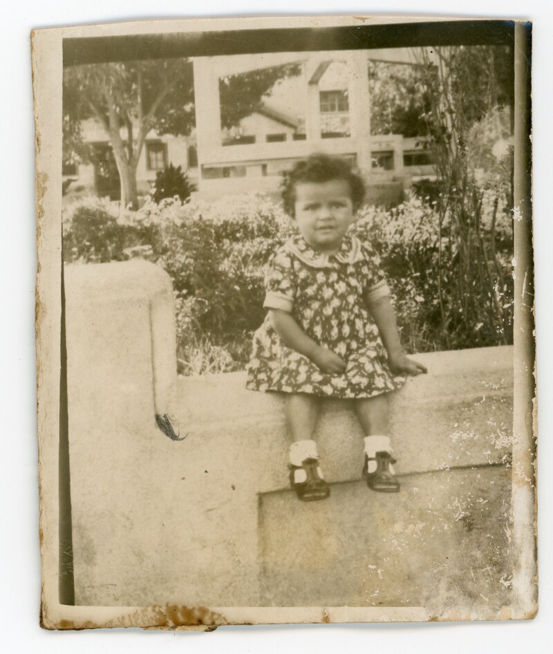 [Niña pequeña de pie sobre una mesa, afirmándose del brazo de un adulto] [Fotografía].