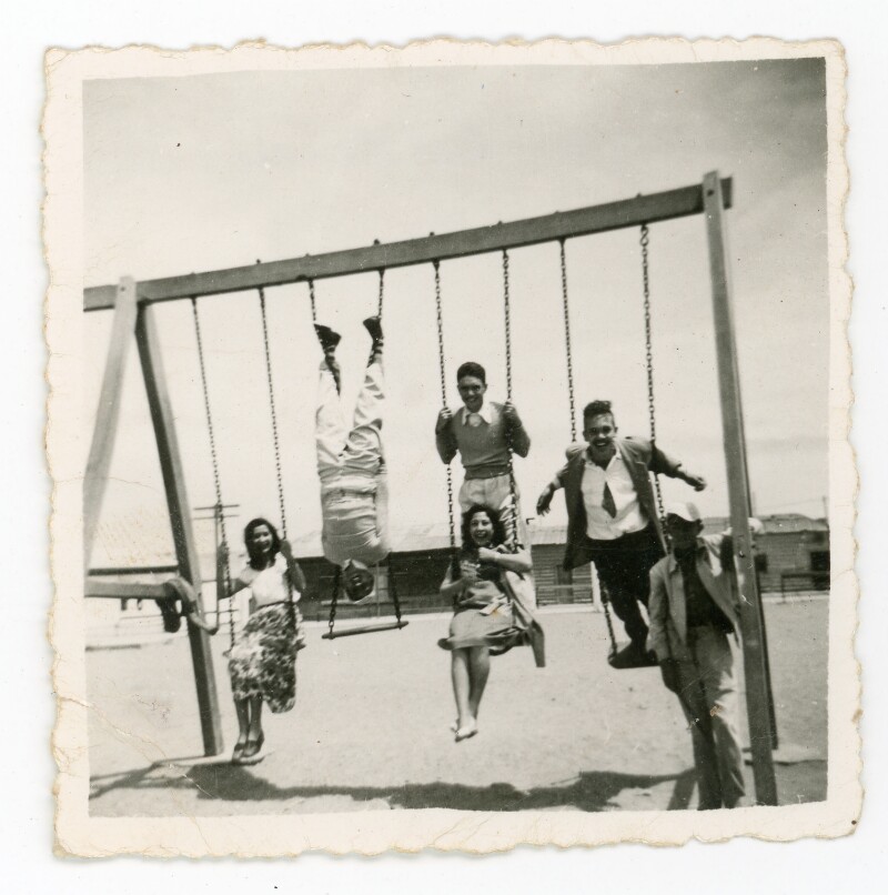 [Grupo mixto de jovenes jugando en los columpios de la antigua plaza de Caldera] [Fotografía].