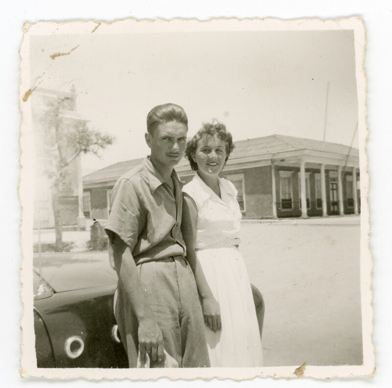[Pareja de jovenes apoyados sobre un auto] [Fotografía].
