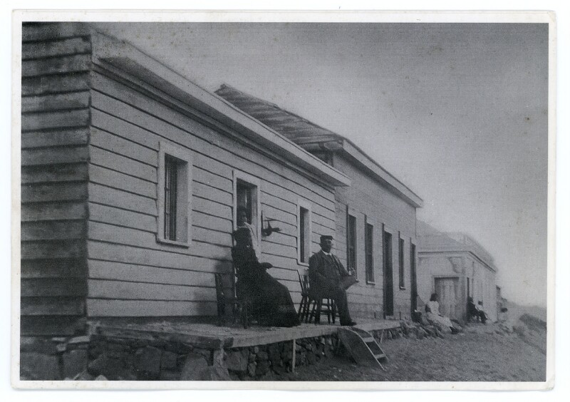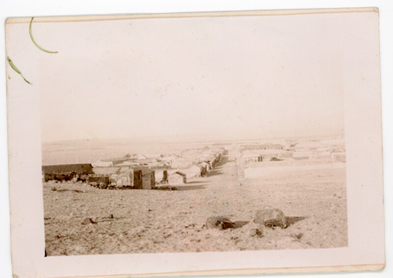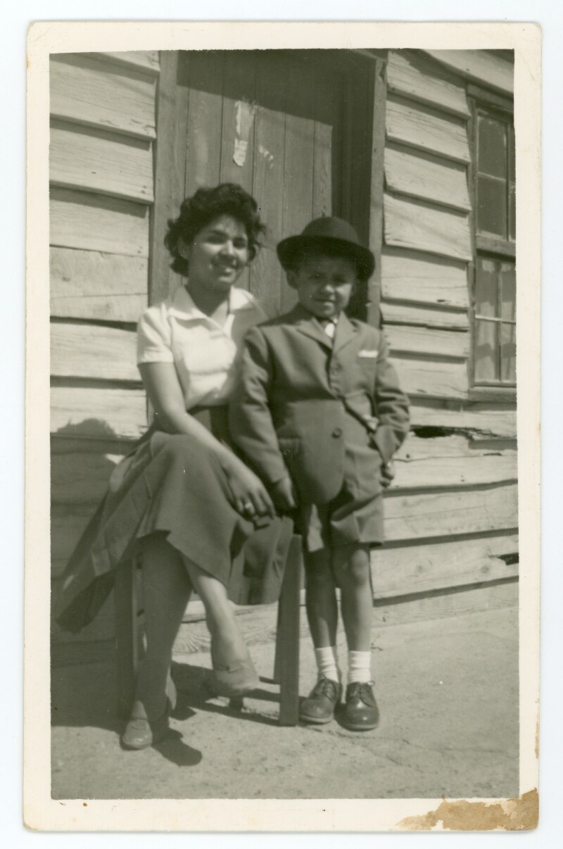 [Jóvenes fuera de las casas de ferrocarriles] [Fotografía].