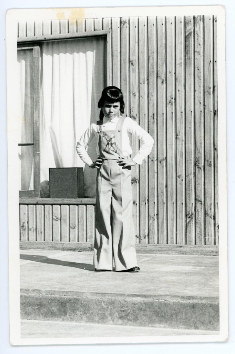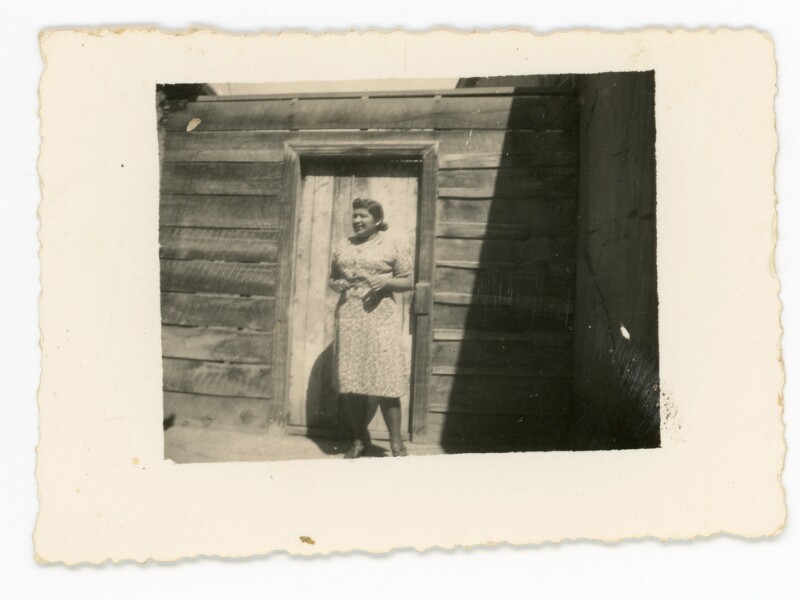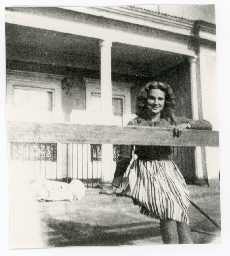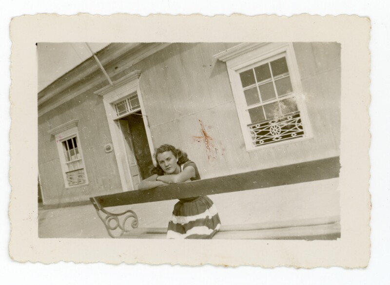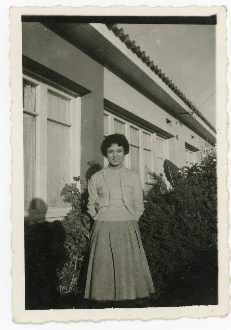 [Retrato individual de una mujer joven al exterior de una casa] [Fotografía].