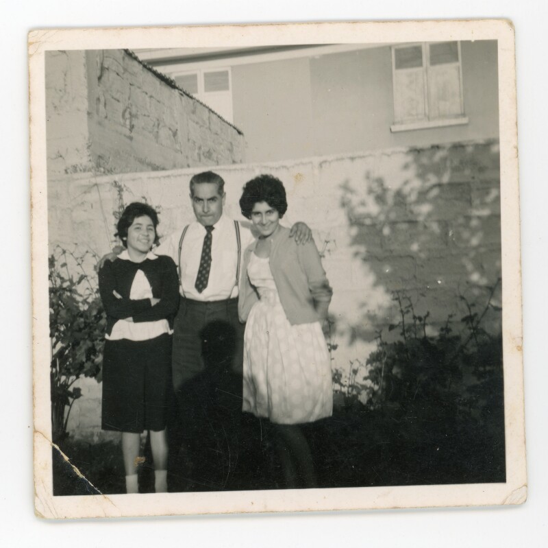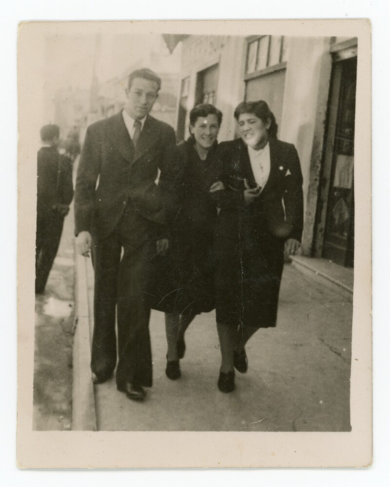 [Dos mujeres junto a un hombre caminando por la vereda] [Fotografía].