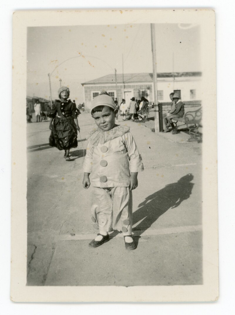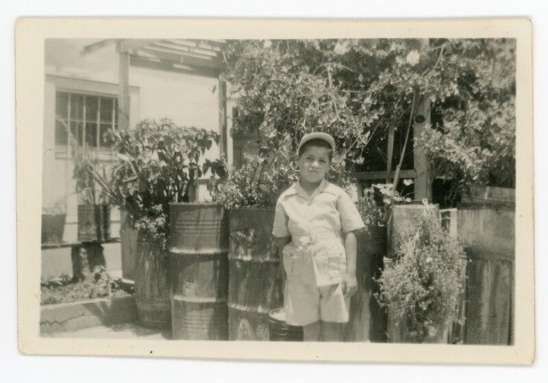 [Niño de pie, vestido con pantalón corto, camisa y gorro] [Fotografía].