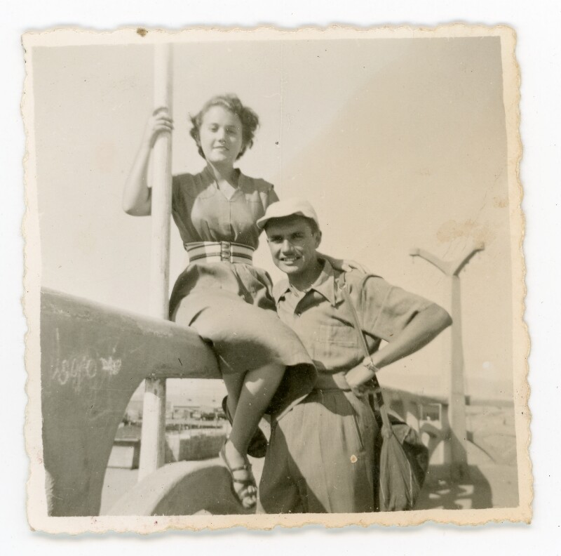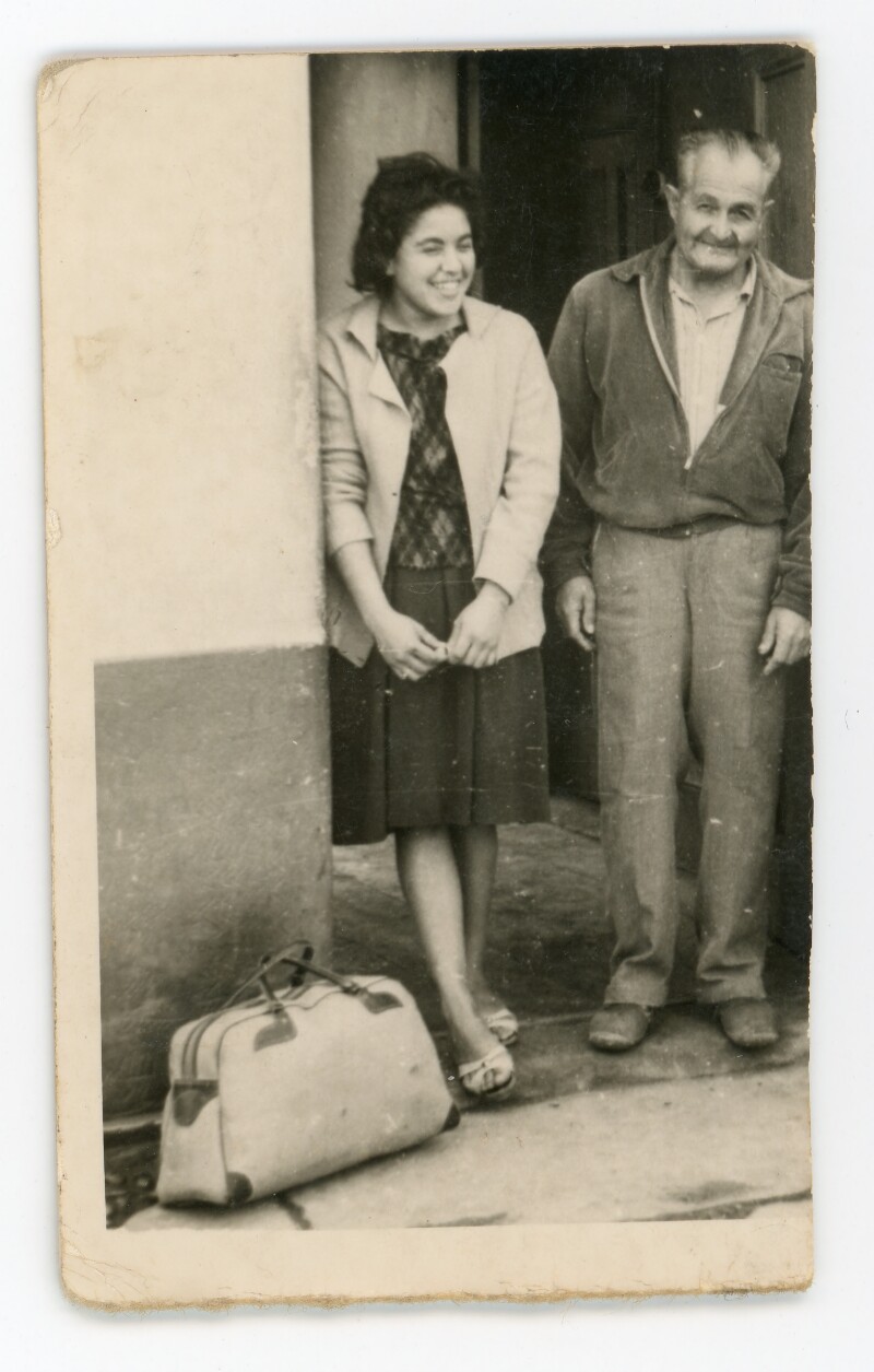[Mujer joven con un bolso a sus pies acompañada de un hombre mayor]. [Fotografía].
