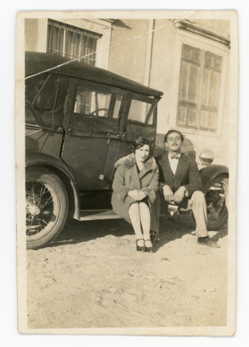 [Pareja de jóvenes sentados sobre la pisadera de un auto ] [Fotografía].