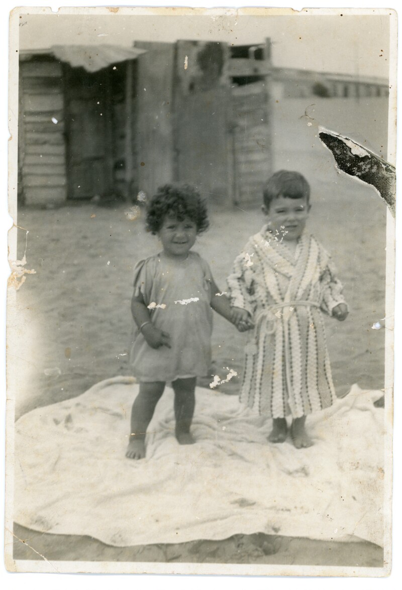 [Dos niños tomados de la mano en la playa] [Fotografía].
