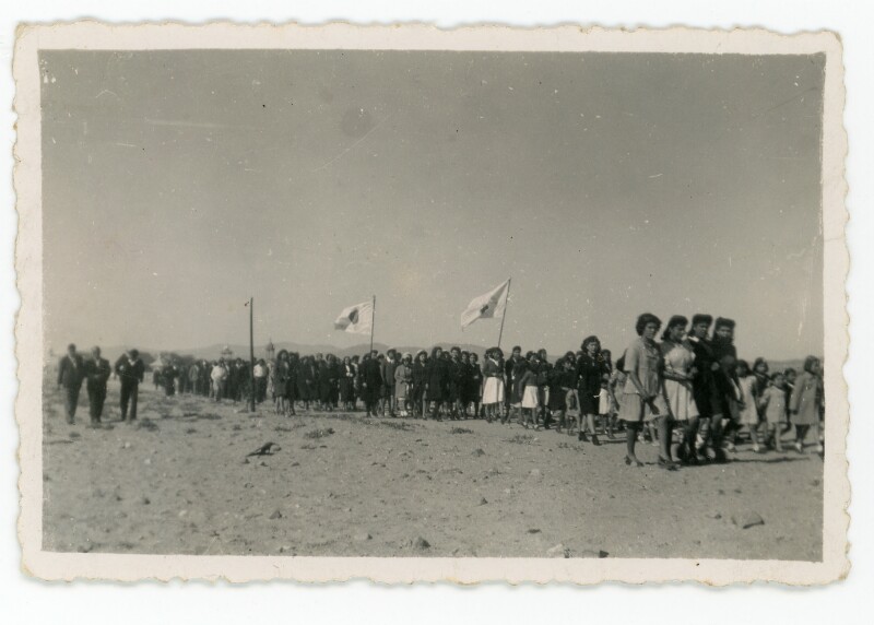 [Grupo de personas sentadas al exterior del cuartel de Carabineros de Caldera] [Fotografía].
