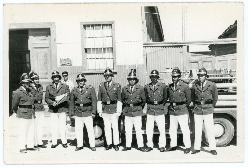 [Grupo de hombres posando delante de un carro de bomberos] [Fotografía].