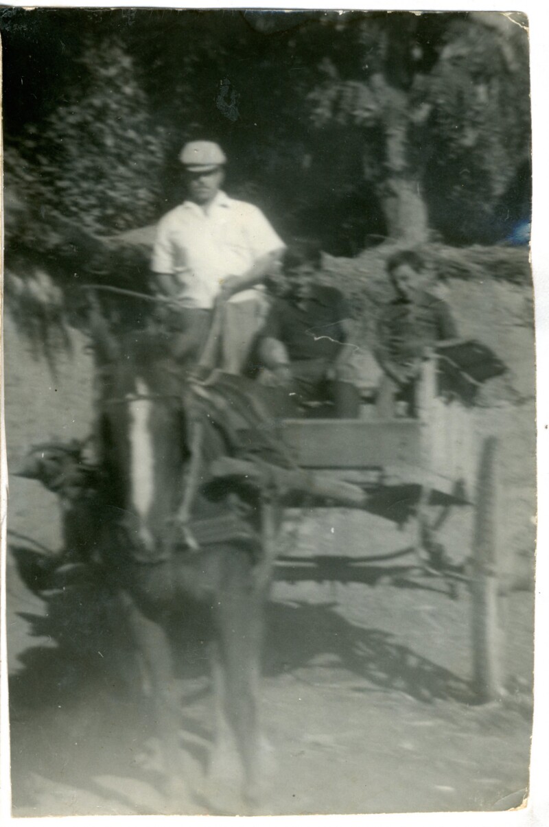 [Personas atrás de un arado arado sostenido por dos caballos : Olga Monare, Blanca Clavijo, Guillermo Contreras, Segundo Aurelio Contreras Vargas] [Fotografía].