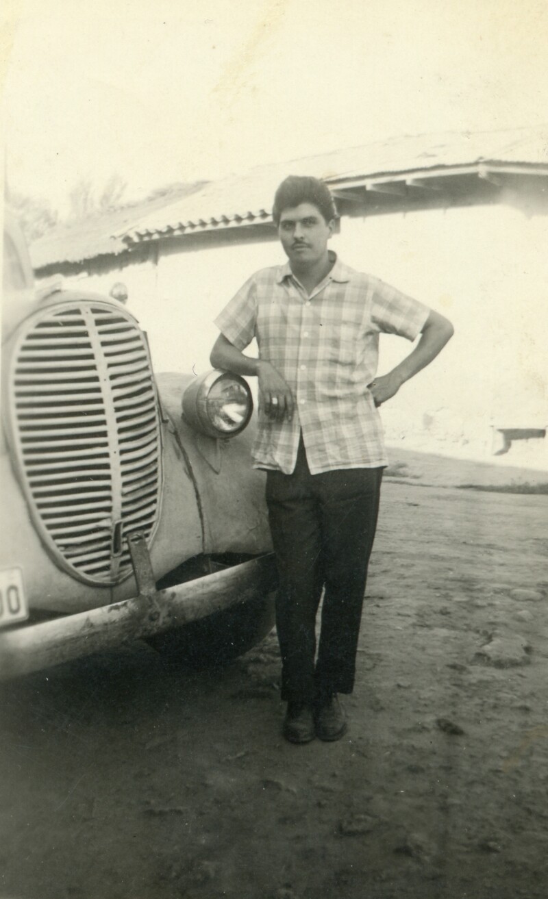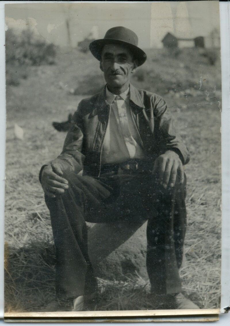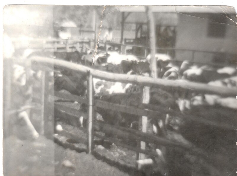 Guillermo Mura sentado en un corral de animales [Fotografía]