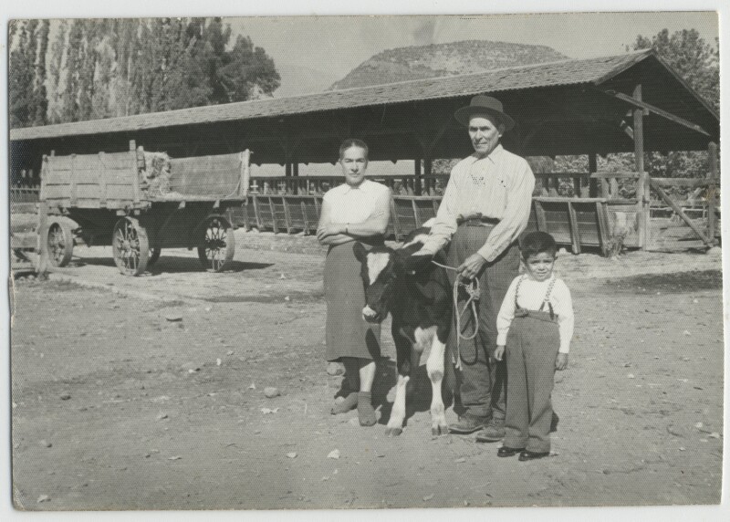 Habitantes de la Hacienda San Vicente en criadero de animales : Inés Ferrada, Aurelio Ponce, Julio Ponce. [Fotografía].