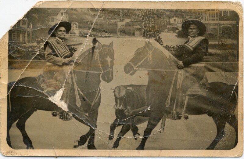 [María Berríos Guzmán y Olga Alicia Vergara sobre una carretela] [Fotografía].