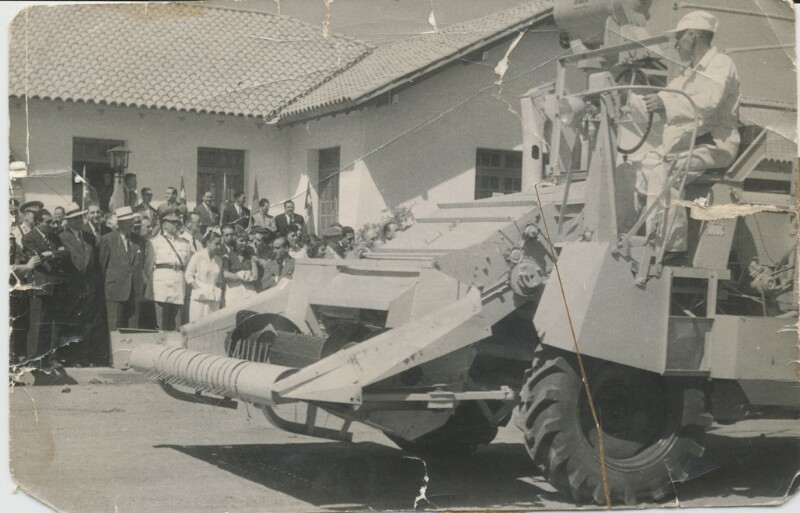 Don Atilio Gallardo conduciendo maquinaria agrícola el día de la visita del presidente Carlos Ibañez del Campo [Fotografía].