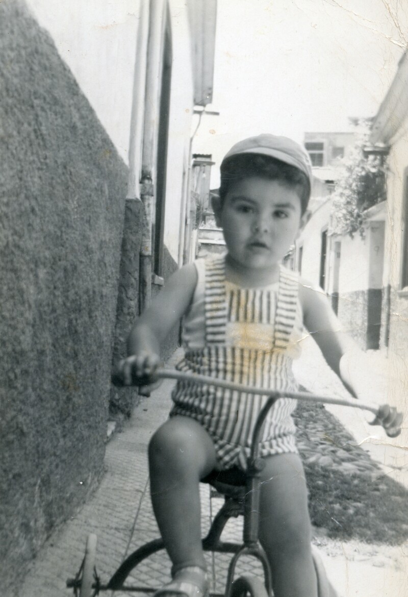 [Niño de pantalon corto sentado en triciclo ] [Fotografía].