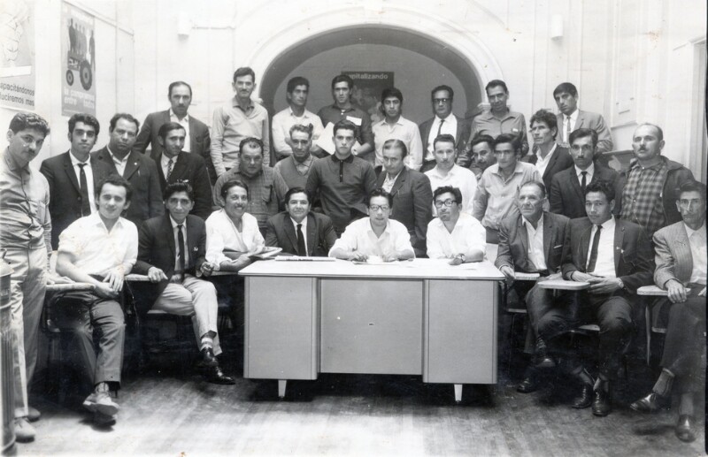 Cuadrilla de trabajadores : Miguel Oyarce, Luis Oyarce, Adán Oyarce, Mario Reinoso, Bernardo Oyarce, Eugenio Caiceo, Enrique Herrera, Sergio Estay, Fernando Pérez, Rubén Martinez, Eliodoro Sanchez, Liberato Céspedes Ramírez, Reginaldo Valenzuela, Domingo Martinez, Mario Reynoso, Nicanor Pereira, Sergio Sepulveda, Reusindo Oyarce, Domingo Morales, Sergio Estay, Juan Berríos, Juan Pereira [Fotografía].