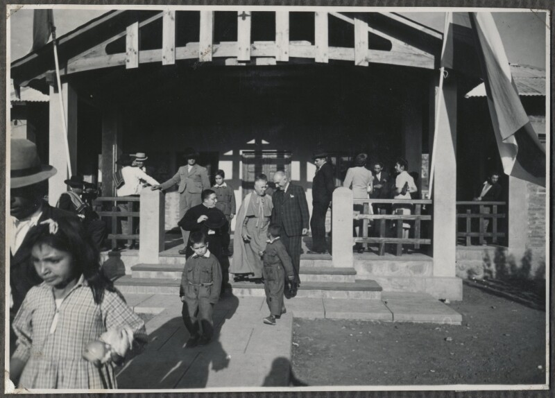 Niños, habitantes y autoridades en ceremonia de bendición del complejo para trabajadores de la Hacienda San Vicente, Actual Escuela Cristo Redentor [Fotografía].