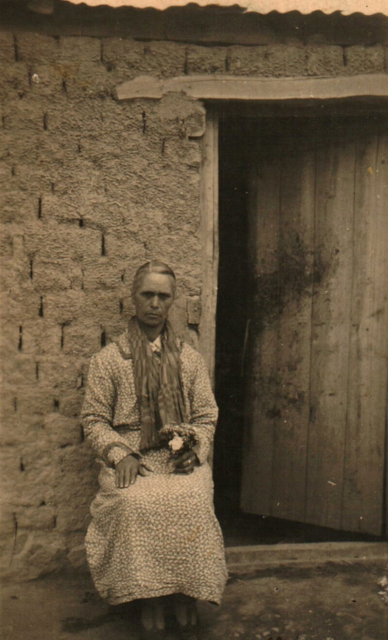 [Retrato de una mujer sentada al exterior de una vivienda] [fotografía].