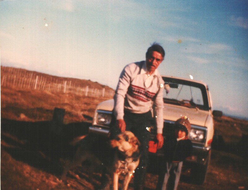 [Hombre adulto sosteniendo un perro, acompañado de un niño] [fotografía].