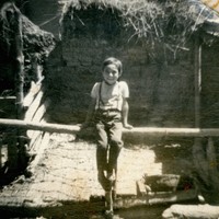 Guillermo Mura sentado en un corral de animales [Fotografía]