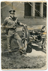 [Miguel Santibañez vestido de uniforme militar junto a artillería] [Fotografía].
