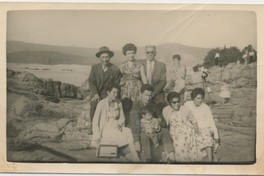 [Grupo de personas de paseo en la playa : Aclicio Gallardo, Nora Ortega, Atilio Gallardo, Manuel Cabrera, Patricio Cabrera, María Gallardo Salinas, Hipolita Gallardo Salinas] [Fotografía]. Chile : [Editor no identificado] , 1960. 1 Fotografía : Formato digital. .