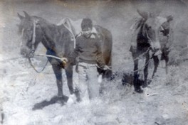 Leonel Ahumada Cortés cuidando de dos caballos [Fotografía]. Chile : [Editor no identificado] , 1961. 1 Fotografía : Formato digital. .