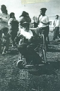 [Hombre en silla de ruedas al aire libre] [Fotografía].