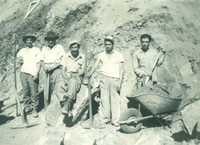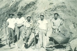 [Oscar Sagua Sagua trabajando junto a otros hombres en la construcción del embalse de Rungue] [Fotografía].