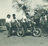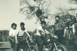 [Retrato grupal mixto de personas montando sus motocicletas en la Plazuela Polpaico: Eliana Ponce Robles, Lenin Ponce, Alberto Ríos, Francisco Ponce Araos] [Fotografía]. Chile : [Editor no identificado] , 1963 1 Fotografía : Formato digital. .
