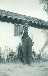 [Francisco Ponce frente a una casa de adobe] [Fotografía].