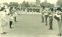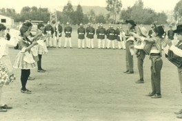 Imágenes del Grupo Folclórico en la Cancha del Estadio Municipal. En esa época la escuela era solo de niñas por lo que ellas utilizaban el vestuario de los hombres.