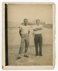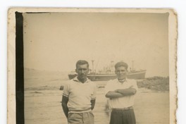 [Retrato de dos hombres en playa Brava] [Fotografía]. Chile : [Editor no identificado] , 1954. 1 Fotografía : Formato digital, monocromo. .