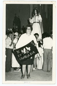 En la fotografía Berta Gallardo se ubica delante de la Virgen de la Candelaria y sostiene un banderin en el que se encuentra escrito lo siguiente: "N. S. De Candelaria B. N°2".