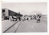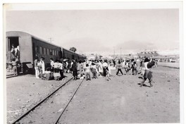 [Arribo de pasajeros en tren] [Fotografía]. Chile : [Editor no identificado] , [1980?]. 1 Fotografía : Formato digital, monocromo. .