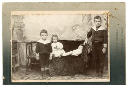 En la fotografía aparece un grupo de cuatro niños, dos de ellos de pie y vestidos con traje ubicados a los costados de un sillón en el cual se ve a un bebe acostado y a una niña de vestido sentada.