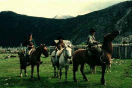 [Tres personas montando a caballo en el sector del Lago Vargas] [fotografía].