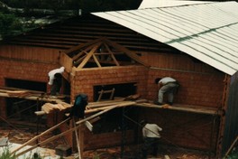 [Grupo de hombres trabajando en la instalación de tejuelas de madera] [fotografía]. Chile : [Editor no identificado] , 2000 1 Fotografía : Formato digital, Policromo. .