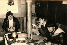 [Retrato grupal de tres hombres comiendo junto a una cocina a leña] [fotografía]. Chile : [Editor no identificado] , 1982. 1 Fotografía : Formato digital, Monocromo. .