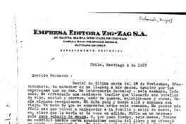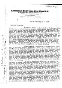 Comenta sobre la Feria de Artes Plásticas del Parque Forestal y menciona algunos artistas y escritores, Le comunica que está trabajando en el Departamento Editorial de Zig-Zag. Informa que Nicomedes Guzmán está muy enfermo y también cuenta algunas historias de Teofilo Cid.
