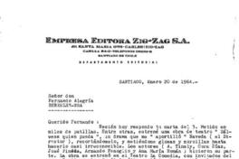 Santiago, Chile [a] Fernando Alegría Carta, 20 de enero 1964, [manuscrito] / Enrique Lafourcade. Imagen digital : Formato PDF (1 hoja) ; 3.825 KB. .